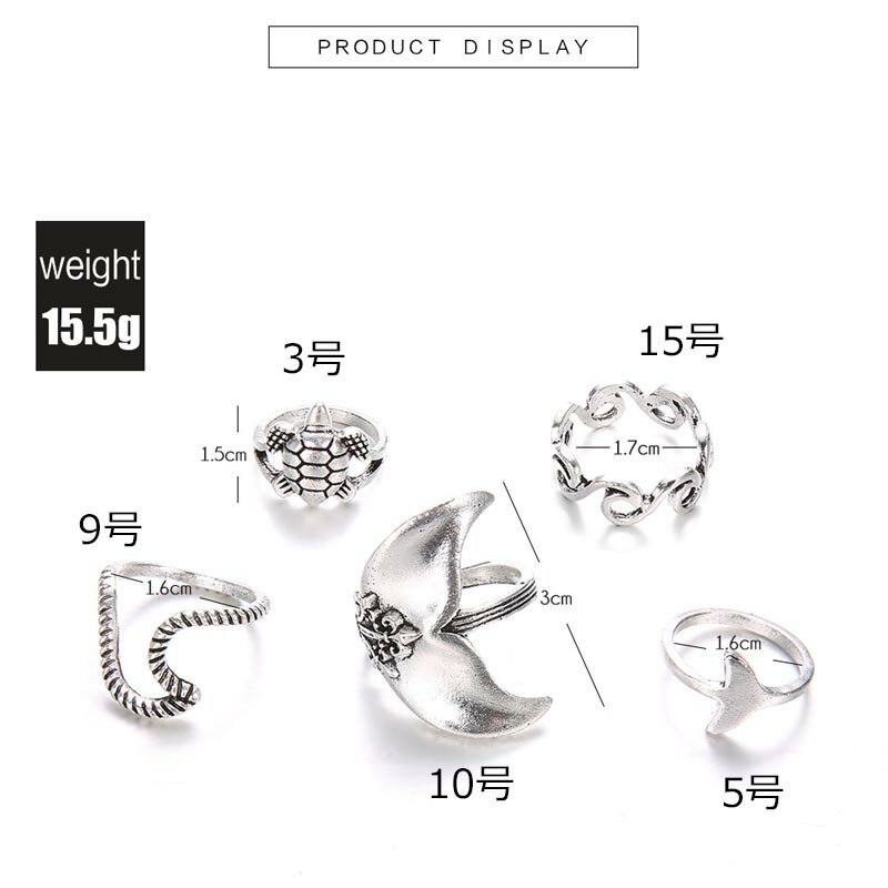 大きな波と亀と大きなイルカの尻尾と小さなイルカのシッポと波が一蹴した5本指輪をセットにした人気のファランジリング。