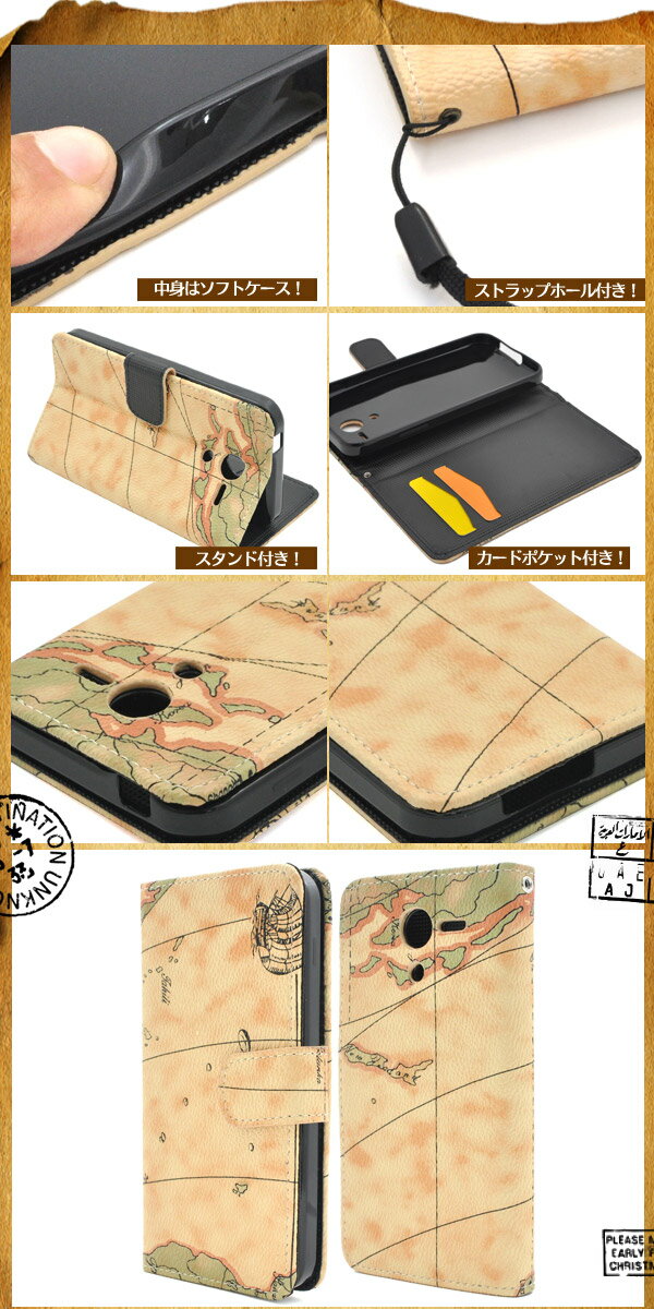 スタイリッシュな地図デザイン!DIGNO F/DIGNO E(503KC)用ワールドデザインケースポーチ レトロな世界地図デザインがオシャレな、DIGNO F/DIGNO E(503KC)用ケースポーチ! 背面を折り返すとスタンドとして使用できるので、動画視聴に最適! 内側にはポケットが2つがあるので、カード類を入れるのに便利です。