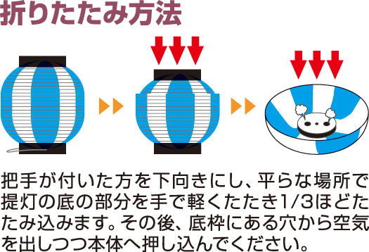 関連アイテム提灯用ソケット1個用 (9027)提灯用ソケット2個用 (9028)提灯用ソケット3個用 (9029)提灯用ソケット4個用 (9030)提灯用ソケット5個用 (9031)【九寸丸】ストライプカラーポリちょうちん (8880) 緑白お祭りの定番ちょうちん !!イベントにも最適です !!■折りたたみ方法イラスト商品情報お祭りの定番ちょうちん !!イベントにも最適です !!<折りたたみ方法>・把手が付いた方を下向きにし、平らな場所で提灯の底の部分を手で軽くたたき1/3ほどたたみ込みます。
